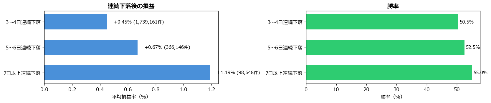 | 5〜6日連続下落 | 366,146件 | 52.5% | +0.67% | 1.304 |