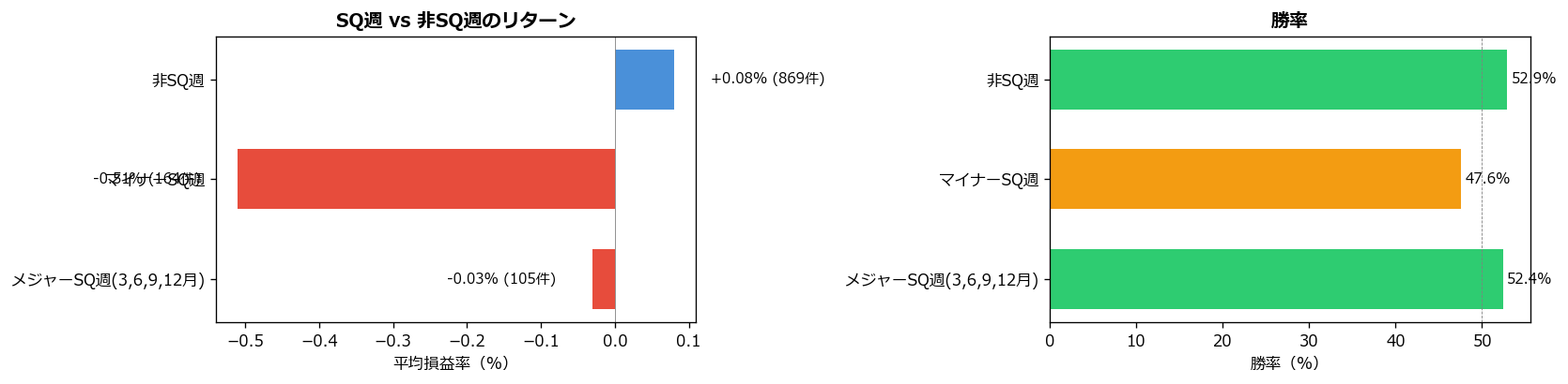 検証結果を見ると、SQ週と非SQ週のリターンには一定の違いが確認できます。